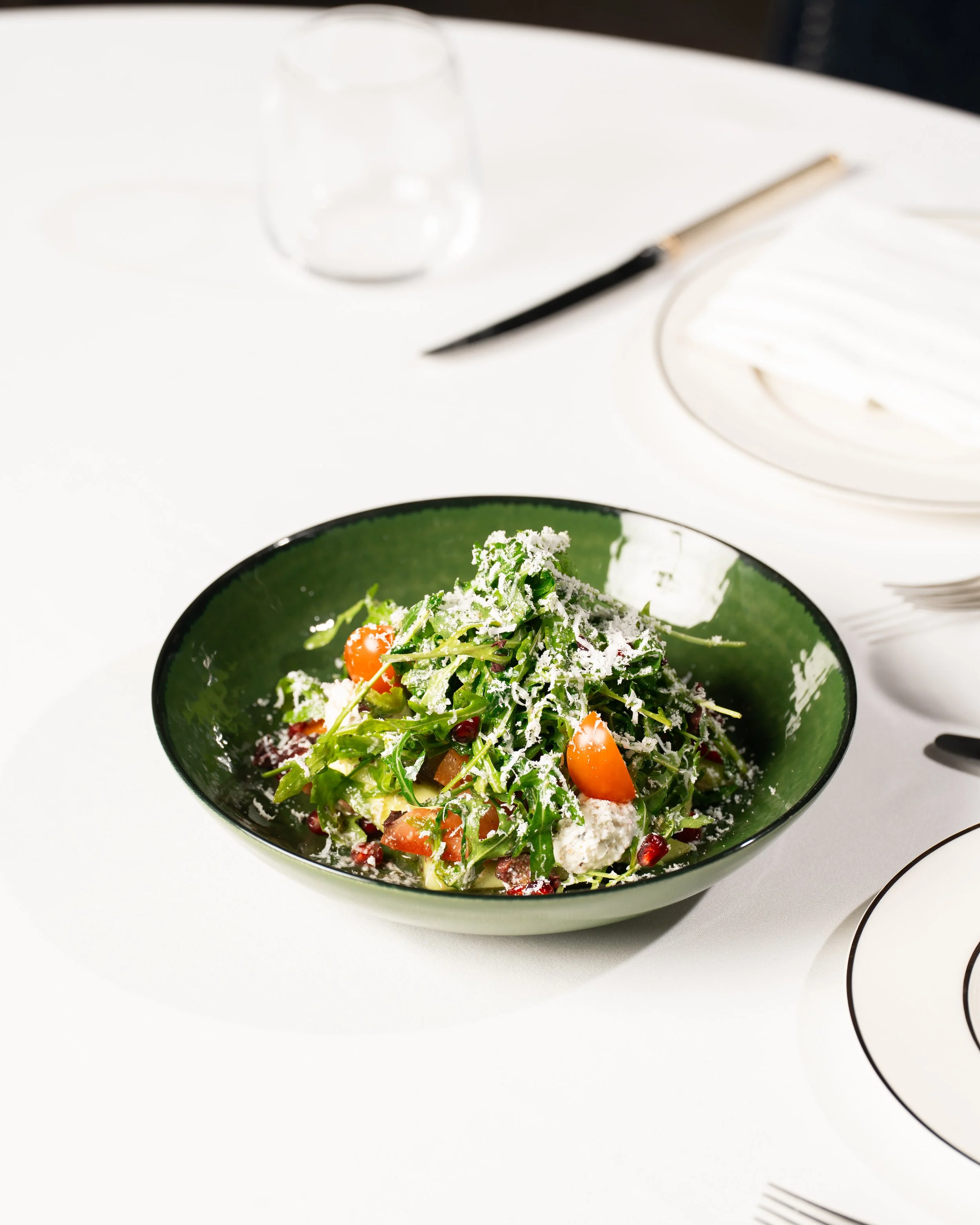 Greek salad with tomatoes, cucumber, red onion & black olives, topped with feta, whipped feta cream, pomegranate, and Greek dressing..