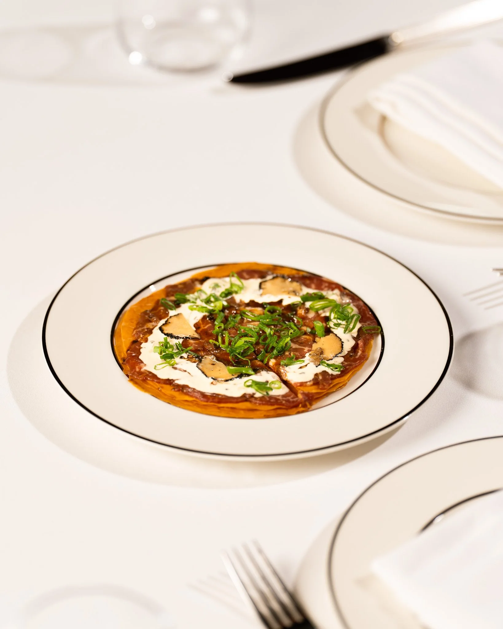 Thinly sliced beef with truffle vinaigrette on a crispy puff pastry.