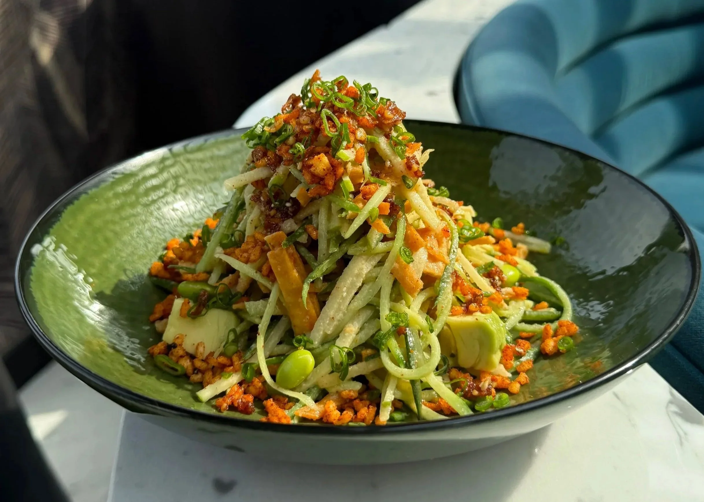 tossed in sesame dressing served with crispy tortilla ,avoccado,apples,edamame topped with crunchy rice and chili crisp. (378 kcal)