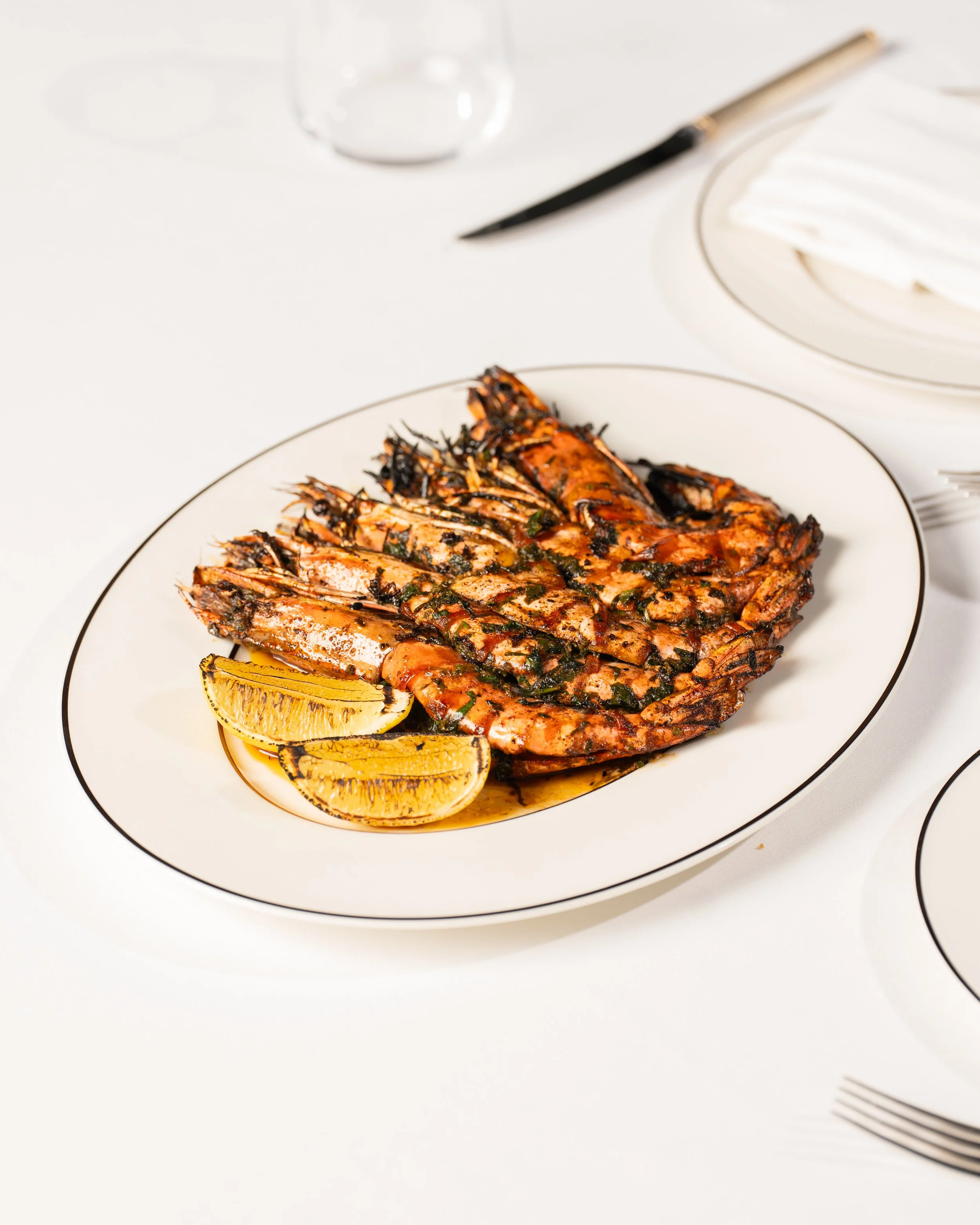 Grilled king tiger prawns marinated in a Mediterranean style marinade, finished with a squeeze of fresh lemon.