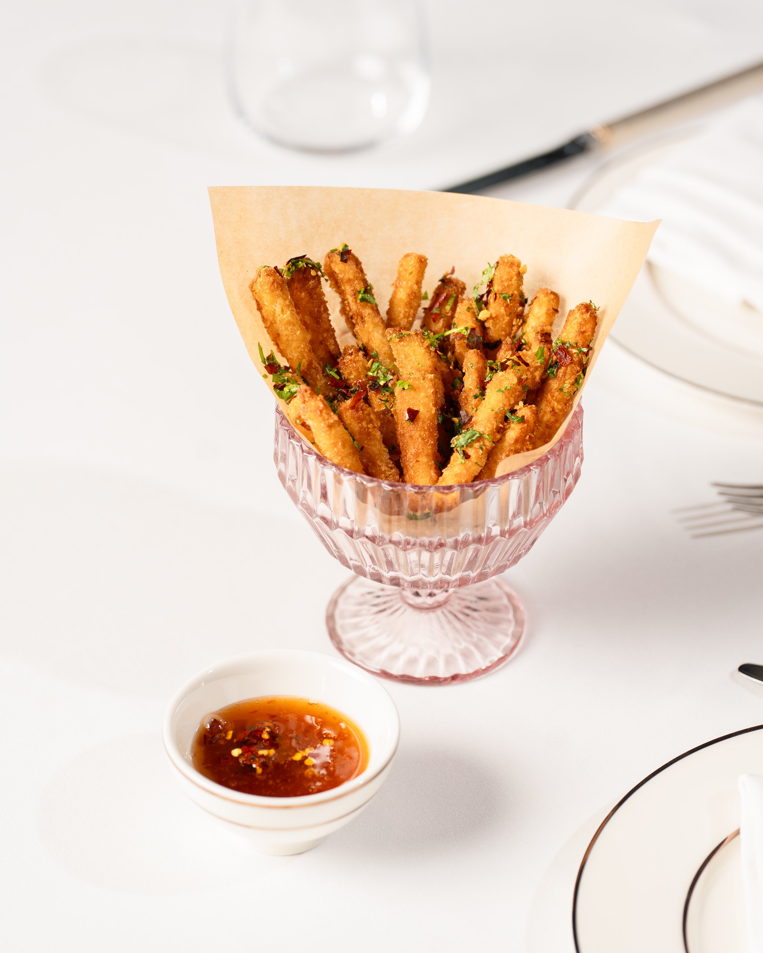 Crispy golden halloumi fries coated in panko, served with sweet & spicy hot honey, finished with chili flakes .