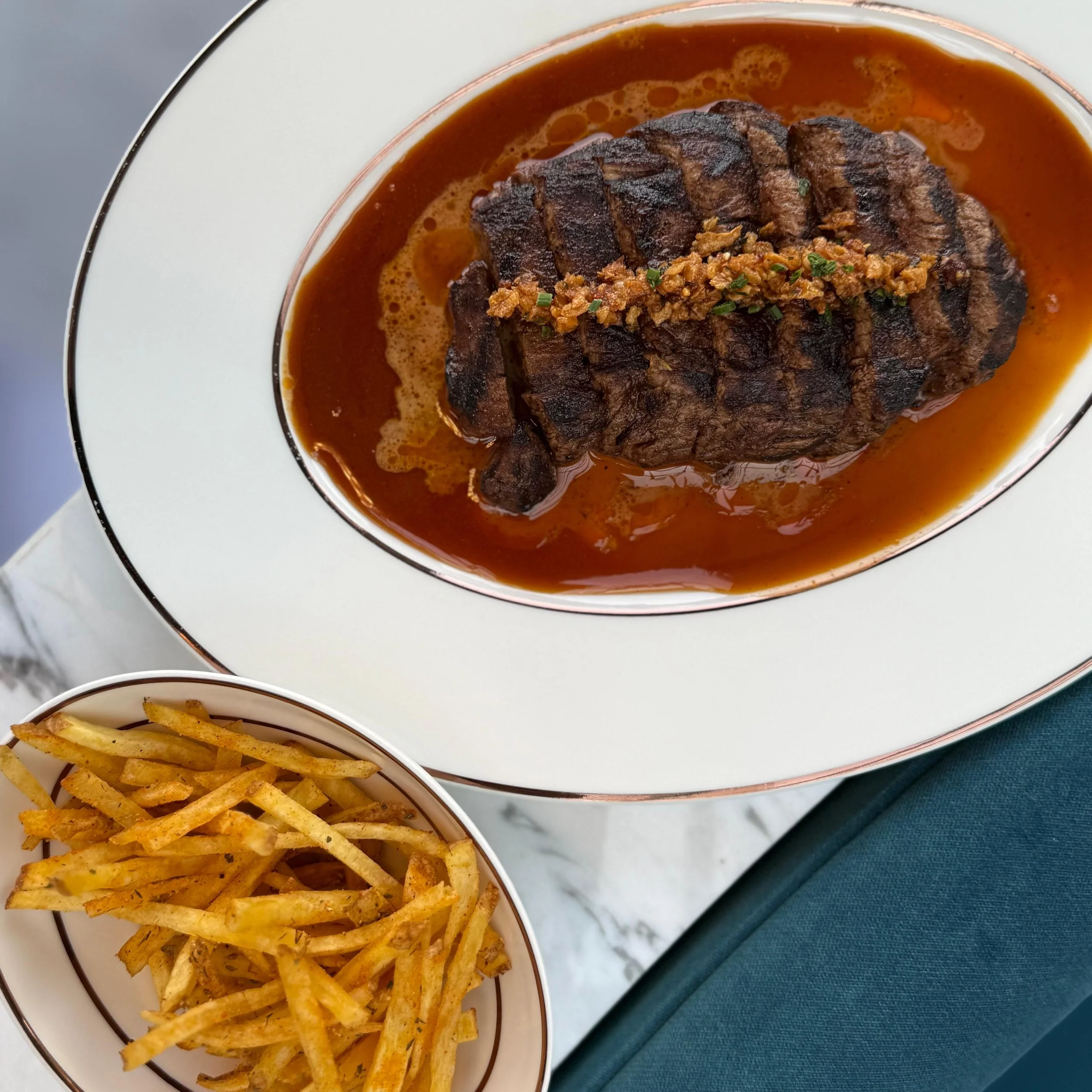 Josper grilled Tenderloin steak, with Mustard teriyaki toped with chili crunch served with fresh fries