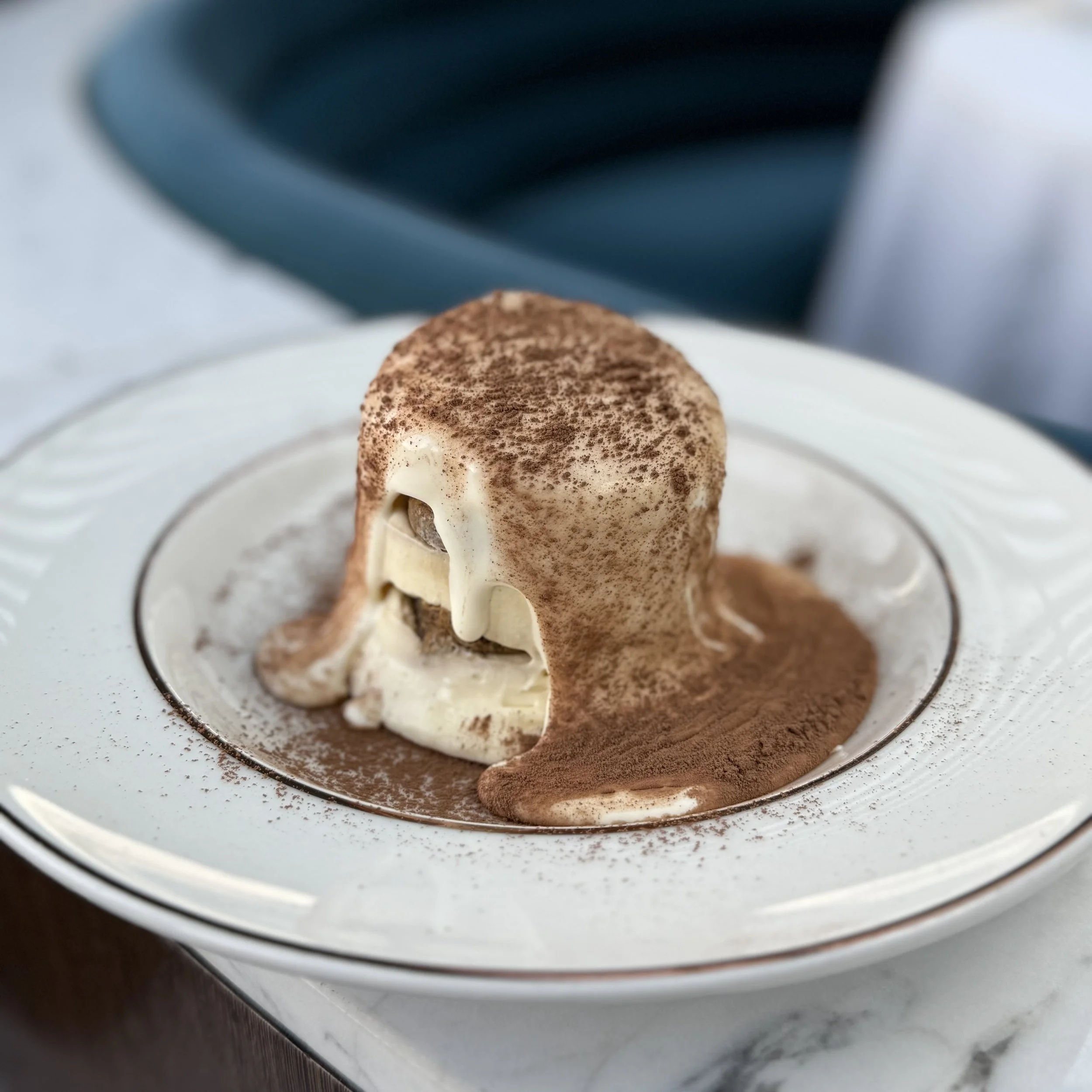 Sponge soaked in coffee , mascarpone cream , and cacao topping