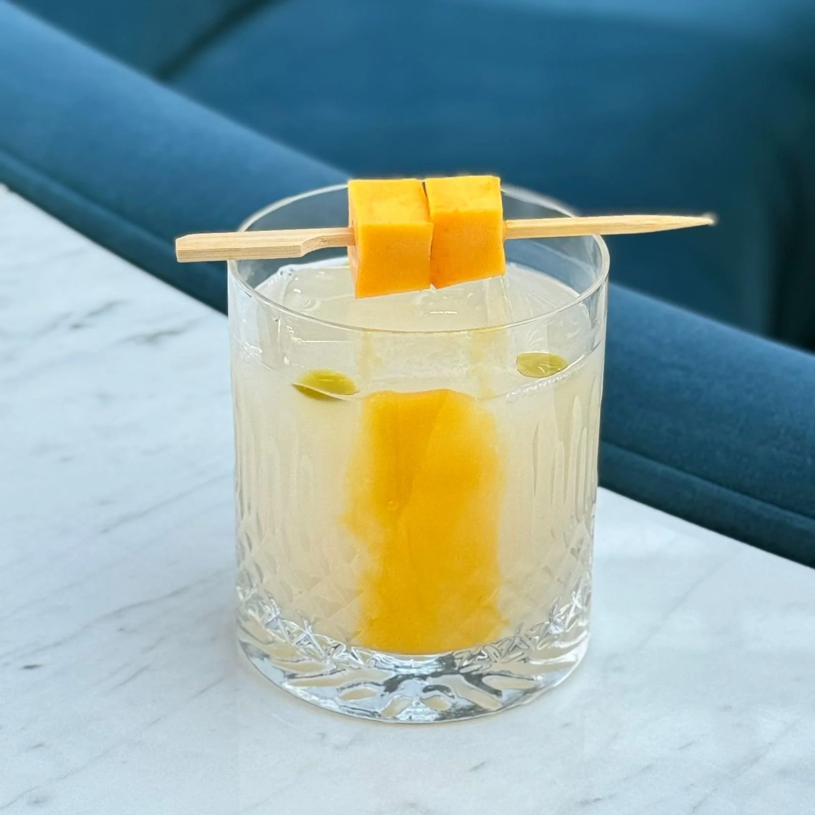 Mango, coconut, chilli, sparkling water, with mango paint and corriander oil.